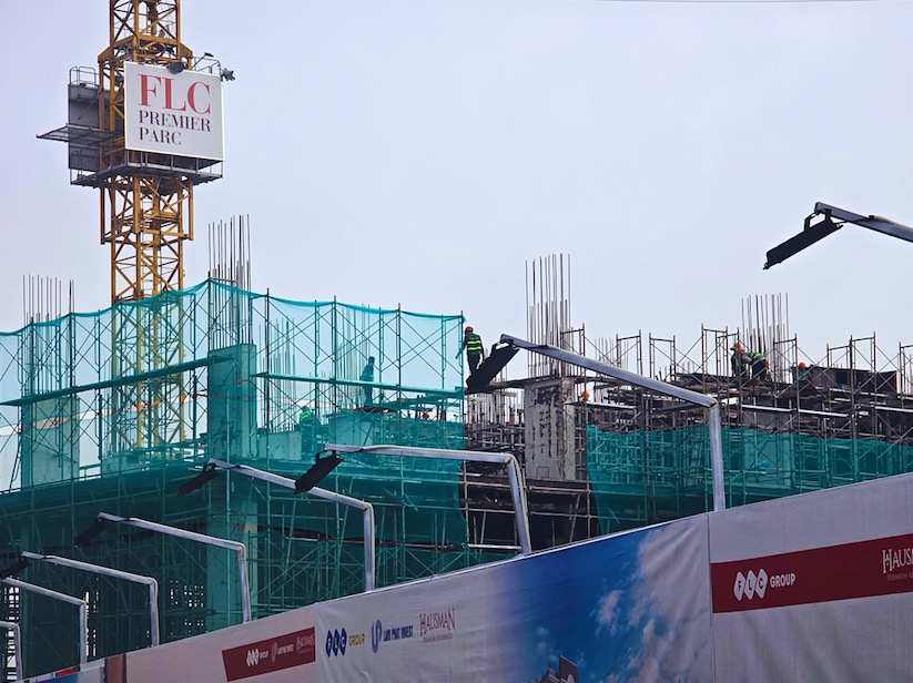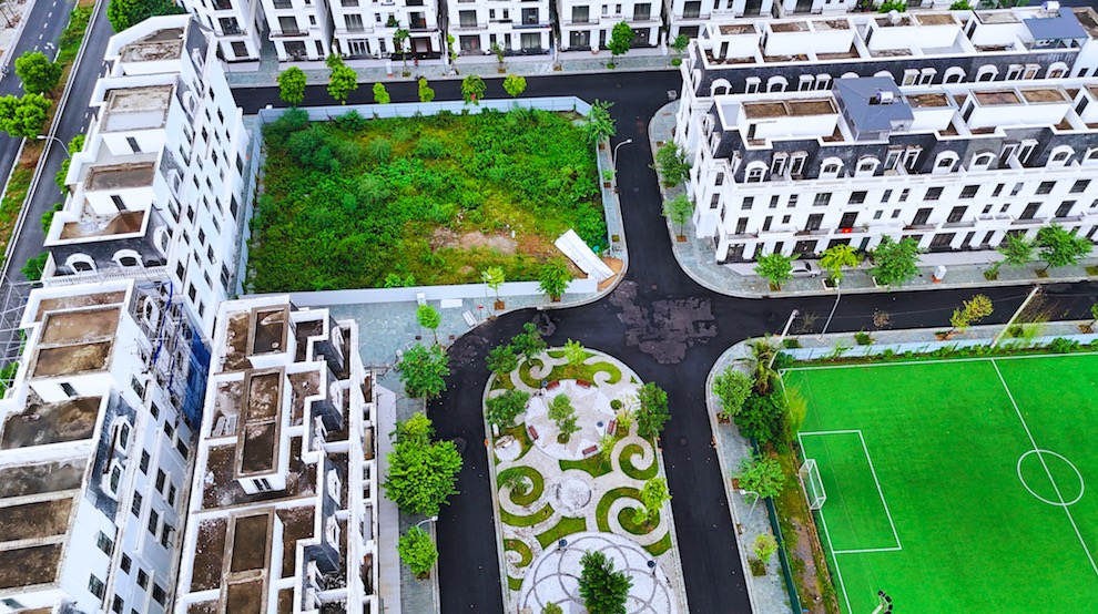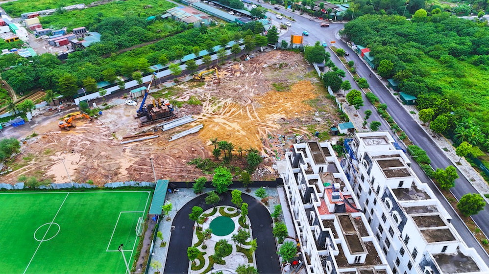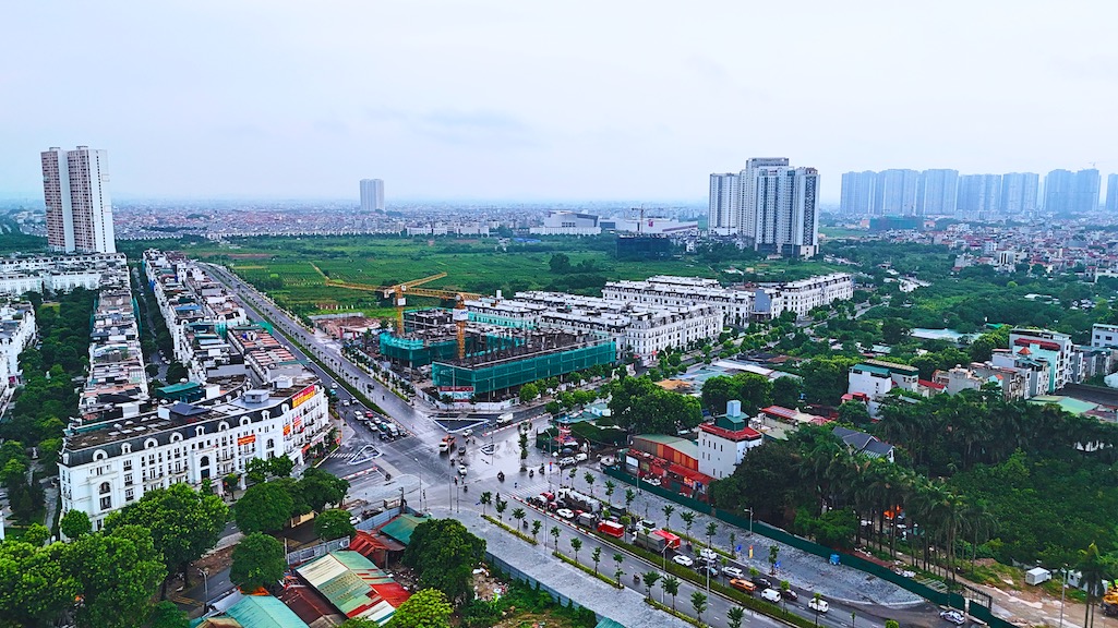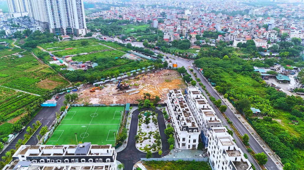 Có thể thấy sự phân tách rõ nét tại dự án khi nhìn từ trên cao, một bên là khu thấp tầng im lìm, chưa có người ở; một bên là khu cao tầng đang trong giai đoạn thi công khẩn trương, che phủ bởi lưới xanh và hệ thống giàn giáo.