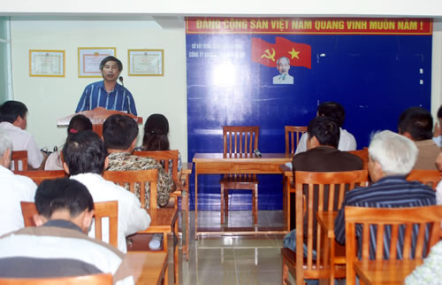 Các nhà trưởng tham gia buổi tuyên truyền, quán triệt về quy định quản lý, bảo vệ chung cư do Cty quản lý nhà tổ chức ngày 10-7.