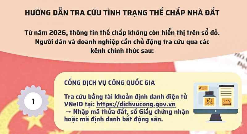 Theo Nghị quyết 254/2025/QH15 của Quốc hội, từ ngày 1/1/2026, thông tin về việc thế chấp quyền sử dụng đất và tài sản gắn liền với đất không còn được ghi trực tiếp trên Giấy chứng nhận quyền sử dụng đất (sổ đỏ) và Giấy chứng nhận quyền sử dụng đất, quyền sở hữu nhà ở và tài sản khác gắn liền với đất (sổ hồng) mà được cập nhật và quản lý tập trung vào Cơ sở dữ liệu quốc gia về đất đai (Cổng Dịch vụ công quốc gia).