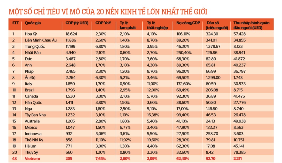 CafeLand - Nền kinh tế có quy mô đứng đầu hiện nay là Hoa Kỳ với GDP theo giá trị hiện tại lên đến 18.624 tỷ USD. Trung Quốc đã vươn lên vị trí thứ 2 với 11.199 tỷ USD, hơn gấp đôi so với quốc gia đứng thứ 3 là Nhật Bản.
