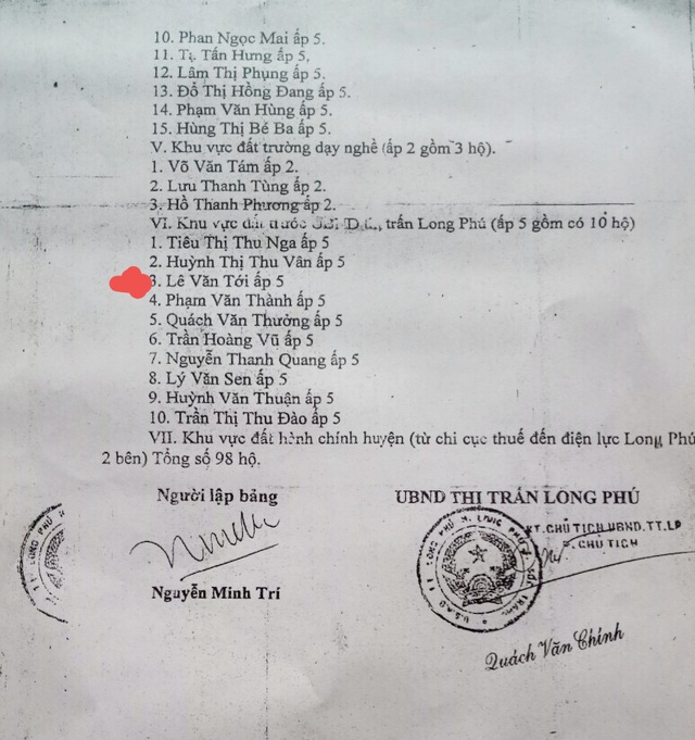 Nói về việc trên, ông Trần Trí Dũng - Phó Chủ tịch UBND thị trấn Long Phú, xác nhận: “Năm 2009, UBND thị trấn đã lập danh sách các hộ lấn chiếm đất công làm nhà ở, trong đó có nhà ông Lê Văn Tới, chưa ai có sổ đỏ. Một số bà con xin sửa chữa, nâng nền nhà nhưng chúng tôi không giải quyết vì đất công. Riêng ông Tới có đơn xin sửa nhà theo hiện trạng nhà cũ và có cam kết sau này nhà nước thu hồi hay giải tỏa ông không yêu cầu đền bù”.