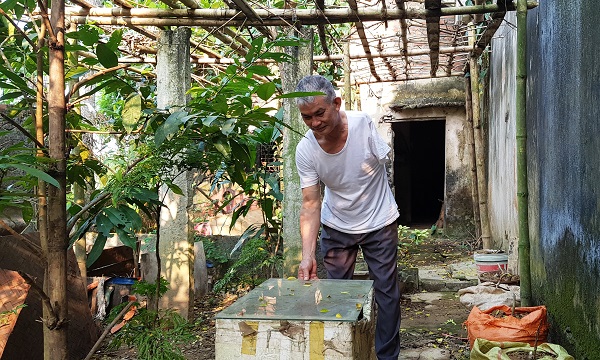 Ông Nguyễn Đình Tớn bên căn nhà đã cũ nát của gia đình.