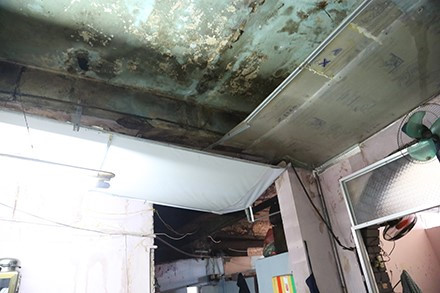 Nước thấm dột từ tầng trên xuống dưới cư dân phải dựng tạm bợ bạt để hứng nước