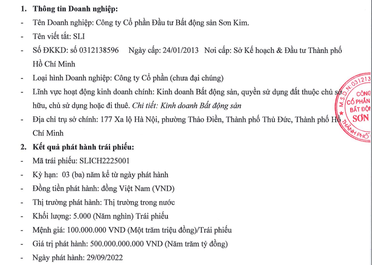 Cụ thể, vào ngày 29/9/2022, Công ty Cổ phần Đầu tư Bất động sản Sơn Kim đã phát hành 5.000 trái phiếu với mệnh giá 100 triệu đồng/trái phiếu, kỳ hạn 3 năm, đáo hạn vào ngày 29/9/2025.
