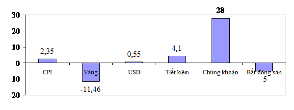 TỐC ĐỘ TĂNG/GIẢM GIÁ TRÊN MỘT SỐ KÊNH ĐẦU TƯ (%). Nguồn số liệu: TCTK và diễn biến thị trường