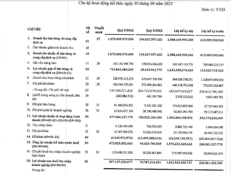 Trích báo cáo tài chính quý 3/2023 của Sunshine Homes.