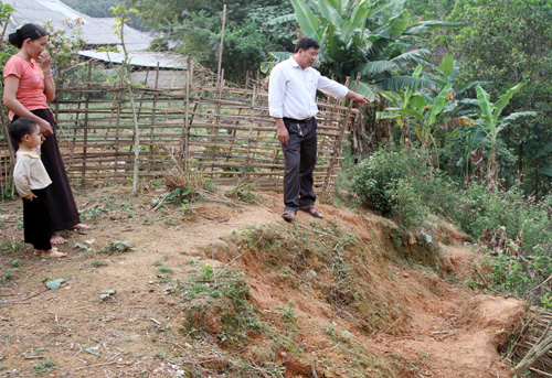 Chủ tịch xã Lò Văn Xương chỉ đường sạt lở vòng cung cạnh nhà dân rất nguy hiểm ở bản Nam (Ta Gia), nhưng vẫn chưa được khắc phục.