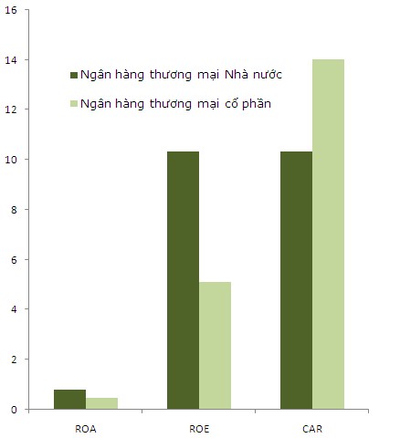 Nhìn chung ở các chỉ tiêu như vốn, ROA, ROE, tỷ lệ cấp vốn tín dụng so với nguồn huy động, tốc độ tăng trưởng của khối ngân hàng Nhà nước đều gấp nhiều lần các ngân hàng cổ phần.