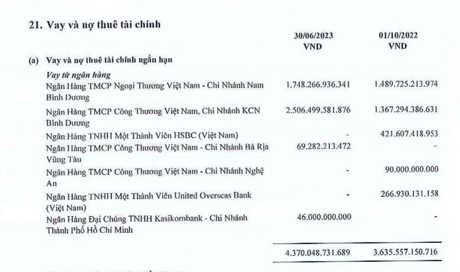 Trong đó, Ngân hàng TMCP Công thương Việt Nam - Chi nhánh KCN Bình Dương (VietinBank Bình Dương) đang là chủ nợ lớn nhất với giá trị cho vay ngắn hạn là hơn 2.500 tỷ đồng, tăng hơn 1.100 tỷ đồng so với thời điểm đầu niên độ. Khoản nợ tại VietinBank Bình Dương chiếm 58% tổng nợ vay ngân hàng tại doanh nghiệp sản xuất tôn mạ này.