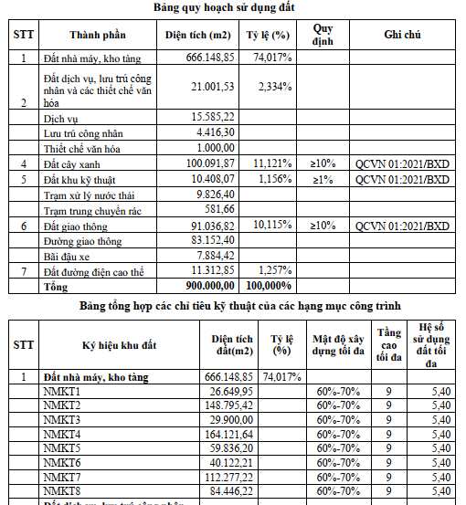 -Đất nhà máy - kho tàng chiếm khoảng 666.149 m² (74% tổng diện tích), mật độ xây dựng thuần tối đa 70% (1-5 tầng) hoặc 60% (6-9 tầng), tầng cao tối đa 9 tầng, hệ số sử dụng đất tối đa 6,4. Ít nhất 3% diện tích đất công nghiệp dành riêng cho doanh nghiệp nhỏ và vừa, công nghiệp hỗ trợ theo Nghị định 35/2022/NĐ-CP.