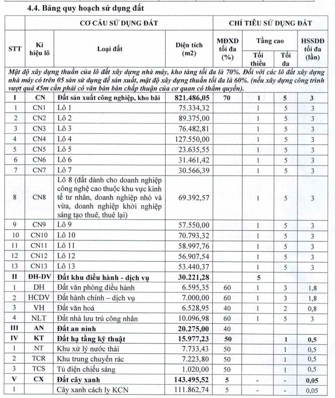 Mật độ xây dựng thuần nhà máy tối đa 70% (60% nếu trên 5 tầng). Hệ thống giao thông nội khu được thiết kế hiện đại với các đường D1-D8, N1-N6, tốc độ khai thác tối đa 40 km/h, kết nối thuận tiện với Tỉnh lộ 822 (lộ giới 50 m). Cao độ nền ≥ 2,30 m để chống ngập lụt.