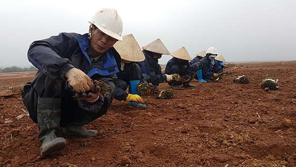 Ông Đào Văn Hằng cùng người dân xã Đoàn Kết trồng cỏ tại dự án Cảng hàng không quốc tế Vân Đồn