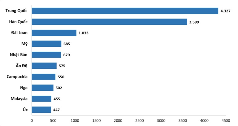 Ở vị trí thứ 3 là thị trường Đài Loan (1 triệu lượt), Mỹ ở vị trí thứ 4 (685 nghìn lượt), Nhật Bản ở vị trí thứ 5 (679 nghìn lượt). Trong top 10 thị trường lớn nhất của du lịch Việt Nam còn có Ấn Độ (575 nghìn lượt), Campuchia (550 nghìn lượt), Nga (502 nghìn lượt), Malaysia (455 nghìn lượt) và Úc (447 nghìn lượt).