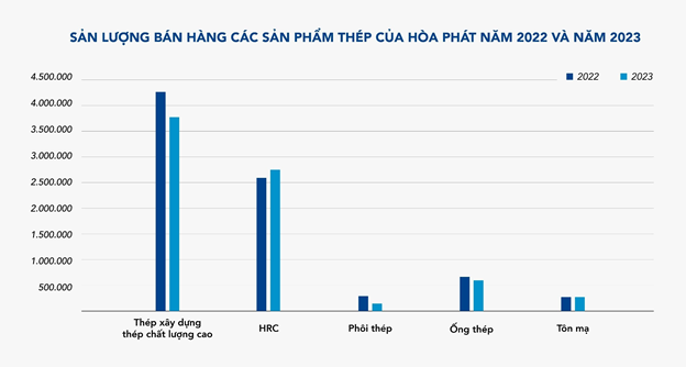 Tính chung cả năm 2023, Hòa Phát đã sản xuất 6,7 triệu tấn thép thô, giảm 10% so với cùng kỳ. Sản lượng bán hàng thép các loại (chưa bao gồm sản phẩm ống thép, tôn mạ) đạt 6,72 triệu tấn, giảm 7% so với cùng kỳ năm 2022.