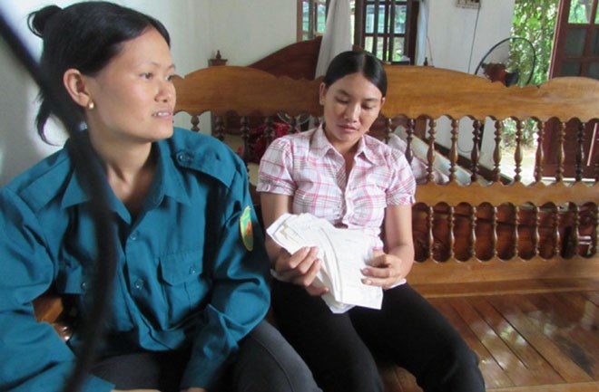 Chị Phạm Thị Nhân (phải) với phiếu thu tiền và giấy giao đất. Ảnh: Xuân Hùng