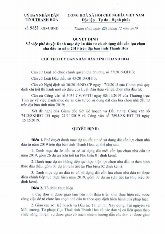 Theo đó, UBND tỉnh phê duyệt danh mục dự án đầu tư có sử dụng đất công bố lựa chọn nhà đầu tư năm 2019 gồm 26 dự án mới, 03 dự án không tiếp tục thực hiện lựa chọn nhà đầu tư theo hình thức đấu thầu và 02 dự án điều chỉnh tiếp tục thực hiện năm 2019.