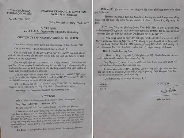 Theo Quyết định số 112/QĐ-UBND ngày 27 tháng 11 năm 2017 V/v đình chỉ công trình xây dựng trật tự xây dựng do UBND phường Quảng Tiến ban hành, ông Nguyễn Sỹ Văn, khu phố Phúc Đức, phường Quảng Tiến, TP Sầm Sơn đã có hành vi xây dựng công trình trái phép trên đất nông nghiệp mà chưa được sự đồng ý của cơ quan chức năng có thẩm quyền cho phép (chưa có giấy phép xây dựng) được quy định tại điểm a khoản 7 điều 13 (Nghị định 121/2013 NĐ-CP ngày 10/10/2013 của Chính phủ về xử phạt vi phạm hành chính trong hoạt động xây dựng, kinh doanh bất động sản, khai thác, sản xuất, kinh doanh vật liệu xây dựng, quản lý công trình hạ tầng kỹ thuật, quản lý phát triển nhà và công sở.