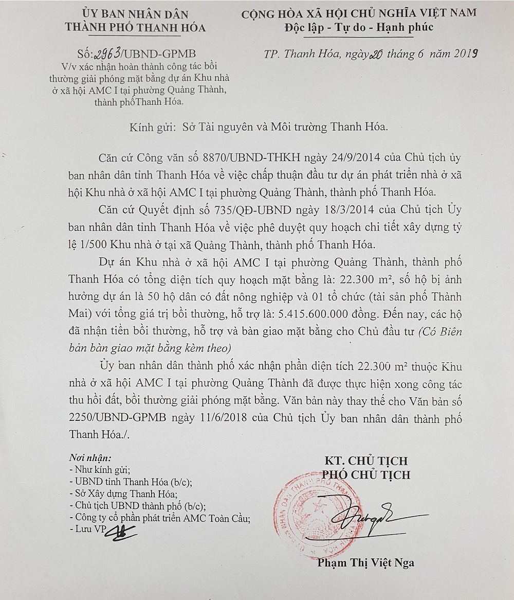 Công văn của UBND thành phố Thanh Hóa gửi Sở Tài nguyên và Môi trường xác nhận đã hoàn tất công tác giải phóng mặt bằng