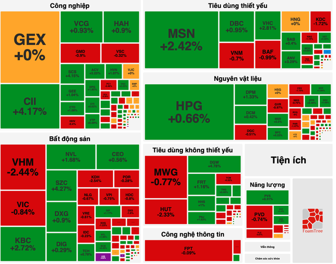 Trong đó, nhóm cổ phiếu tiêu dùng vẫn giữ đà tăng tích cực: MSN tăng 2,42%, VHC tăng 2,81%, ANV tăng 3,29%, DGW tăng 4,76%, FRT tăng 1,16%, PNJ tăng 1,63%...