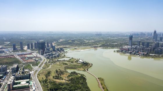 Hồ nhân tạo và không gian xanh của Tianfu bao phủ hơn một nửa thành phố. Ảnh: Bloomberg