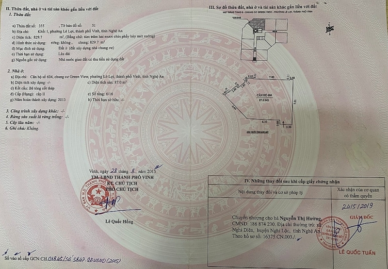 Tương tự, tại căn hộ số 604, chung cư Green View tại phường Lê Lợi, thành phố Vinh mang tên bà Nguyễn Thị Hường đã thế chấp và cầm cố chỗ ông Nguyễn Duy Thứ tại xã Nghi Công, huyện Nghi Lộc, tỉnh Nghệ An. Khi ông Nguyễn Duy Thứ đưa Giấy chứng nhận quyền sử dụng đất, quyền sở hữu căn hộ đến Chi nhánh Văn phòng Đăng ký đất đai thành phố Vinh để kiểm tra tính pháp lý thì phát hiện là giấy chứng nhận giả.