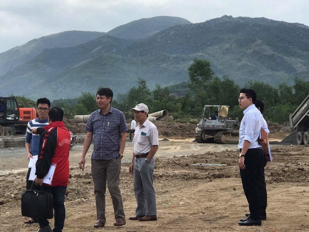 Đoàn kiểm tra của cơ quan chức năng đang kiểm tra việc thi công đường 74, tại dự án Trung tâm thương mại - Khu nhà ở liên kế Phước Lợi. Ảnh: C.H