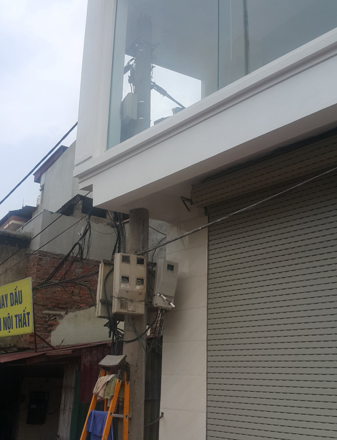 Cột điện vẫn đang truyền tải điện được chủ nhà xây tường ôm lại - Ảnh: TTO