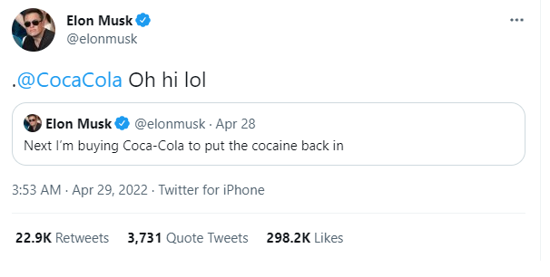 “Tiếp theo, tôi sẽ mua Coca-Cola để đưa cocain quay trở lại trong thành phần của đồ uống này”, Elon Musk viết trên mạng xã hội Twitter.