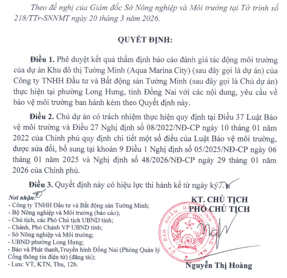 Quyết định 013/QĐ-UBND có hiệu lực ngay từ ngày ký. Chủ dự án phải triển khai ngay các công trình bảo vệ môi trường, chương trình giám sát và báo cáo định kỳ cho cơ quan chức năng. Đây là tín hiệu tích cực cho thị trường bất động sản Đồng Nai, khẳng định định hướng phát triển đô thị xanh – thông minh – bền vững.