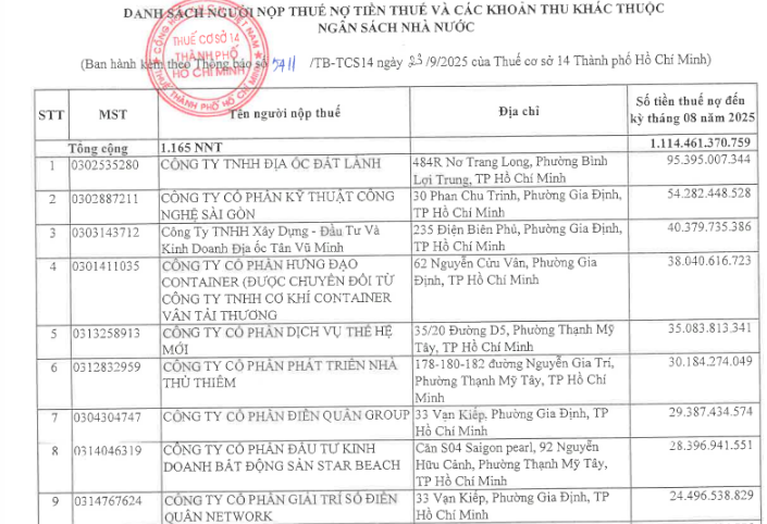 Trước đó, Thuế TPHCM cũng công khai danh sách các doanh nghiệp nợ thuế và các khoản thu khác thuộc ngân sách Nhà nước tính đến tháng 7, có 195 doanh nghiệp nợ thuế trên 90 ngày với tổng số tiền 1.187 tỷ đồng. Ghi nhận, 3 doanh nghiệp nợ hơn 100 tỷ đồng cũng đều hoạt động trong lĩnh vực đầu tư, kinh doanh bất động sản.