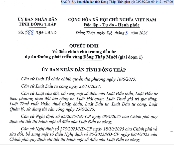 Quyết định điều chỉnh chủ trương đầu tư dự án đường phát triển vùng được ban hành trong bối cảnh Đồng Tháp đang bước vào giai đoạn tăng tốc đầu tư hạ tầng.