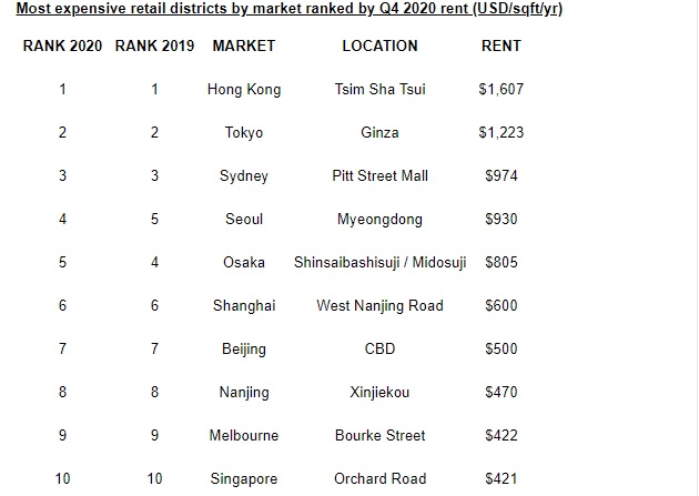 Trong số các thị trường lớn tại châu Á, lĩnh vực bán lẻ ở Trung Quốc là nơi chịu thiệt hại ít nhất, với mức giảm trung bình chỉ 5%. Ông Keith Chan, người đứng đầu bộ phận nghiên cứu thị trường tại Cushman & Wakefiled cho biết: “Mặc dù chịu tổn thất nặng nề, Hong Kong vẫn giữ vững vị trí dẫn đầu trong ngành bán lẻ tại khu vực châu Á – Thái Bình Dương trong năm vừa qua. Điều này phản ánh giá thuê mặt bằng tại Hong Kong là rất cao, bất chấp đã có sự sụt giảm mạnh vì đại dịch Covid-19. Đứng sau Hong Kong lần lượt là Nhật Bản, Úc và Hàn Quốc”.