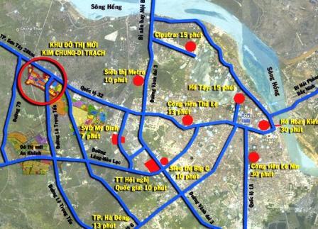 Dự án Kim Chung- Di Trạch (Vòng tròn đỏ) không xa trung tâm Hà Nội, hiện có giá dao động từ 25-28 triệu đồng/m2