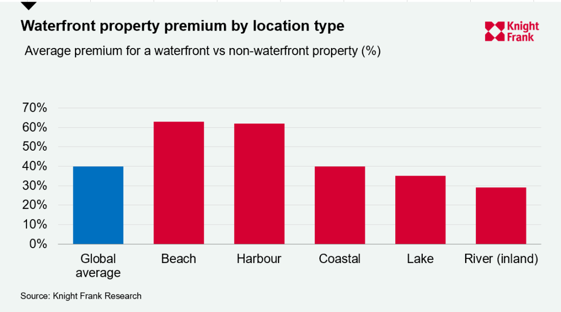 Theo báo cáo của Knight Frank, giá bất động sản hướng thủy có mức cao hơn trung bình 40% so với sản phẩm cùng quy mô, phản ánh xu hướng sống xanh và hướng thủy ngày càng được ưa chuộng.