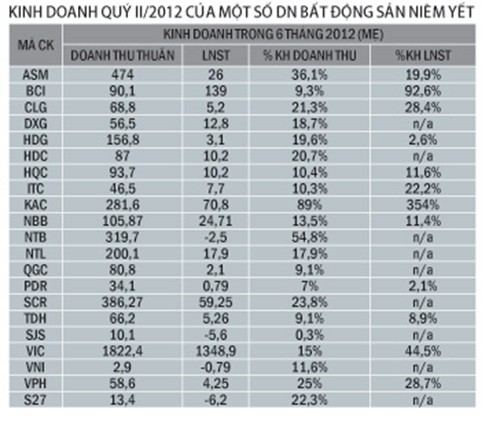 | Khảo sát hơn 70 doanh nghiệp bất động sản niêm yết, giá trị hàng tồn kho cuối quý II/2012 đạt 72.405 tỷ đồng tương đương khoảng 3,1 tỷ USD. Có 18/72 doanh nghiệp có giá trị hàng tồn kho trên 1.000 tỷ đồng |