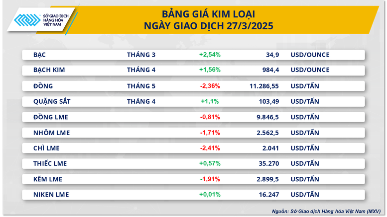 Sở Giao dịch hàng hóa Việt Nam (MXV) cho biết, giá hàng hóa nguyên liệu thế giới tiếp tục biến động trong phiên giao dịch ngày 27/3. Đóng cửa, chỉ số MXV-Index giảm nhẹ 0,03% về mức 2.300 điểm.