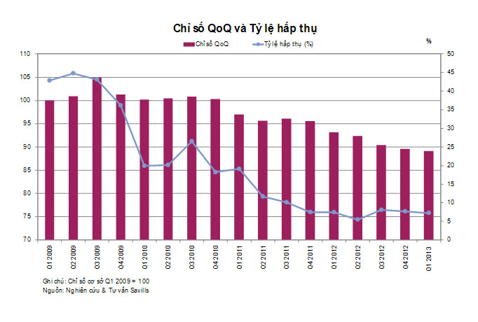 Cùng với việc gia tăng của chỉ số hoạt động, lượng hấp thụ của thị trường văn phòng quý này cũng tăng mạnh 173% so với quý trước và 70% so với cùng kỳ năm ngoái. Đây là những dấu hiệu lạc quan cho thấy sự hồi phục và ổn định của thị trường văn phòng trong những quý tiếp theo.