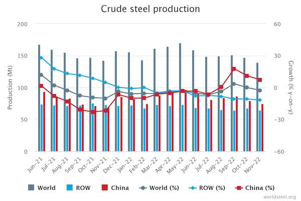 World Steel cho biết, sản lượng thép thô Trung Quốc trong tháng 11 đạt 74,5 triệu tấn, tăng 7,3% so với cùng kỳ năm trước. Tính chung 11 tháng đầu năm, sản lượng thép thô của Trung Quốc đạt 935 triệu tấn, giảm 1,4% so với cùng kỳ năm 2021.