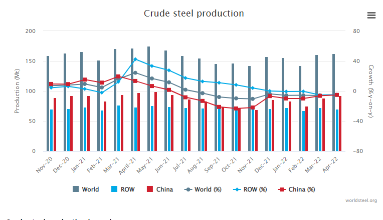 Sản lượng thép thô thế giới đến tháng 4/2022