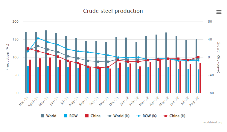 Sản lượng thép thô toàn cầu trong tháng 8/2022