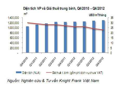 Giá thuê văn phòng hạng A đã giảm nhẹ trong quý 4/2012, đạt khoảng 646.000 đồng/m2/tháng. Mặc dù hầu hết các yêu cầu tìm thuê văn phòng đều hướng đến phân khúc hạng B nhưng giá thuê của phân khúc này vẫn giảm nhẹ, đạt mức khoảng 438.000 đồng/m2/tháng.