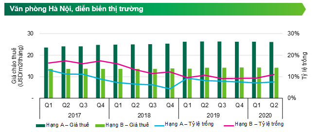 Do sự thu hẹp của khách thuê, tỷ lệ trống của cả hai Hạng đã tăng trong quý II/2020. Tỷ lệ trống của văn phòng Hạng A tăng 0,4 điểm phần trăm so với quý trước, lên mức 7,6%, trong khi tỷ lệ trống của văn phòng Hạng B tăng 1,7 điểm phần trăm so với quý trước, lên mức 11,0% tại thời điểm cuối quý II/2020.