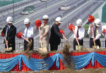 Phó Thủ tướng Hoàng Trung Hải, Bộ trưởng Bộ GTVT Hồ Nghĩa Dũng và Phó Chủ tịch Thường trực UBND TP Nguyễn Thành Tài… phát lệnh khởi công xây dựng nhánh giữa cầu Rạch Chiếc mới. Ảnh: L.ĐỨC