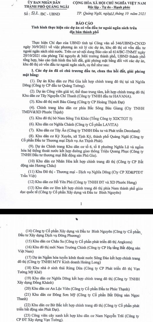 Trước đó, ngày 15.10.2021, ông Nguyễn Công Hoàng – Giám đốc Sở Xây dựng tỉnh Quảng Ngãi ký Công văn số 2128/SXD-QLN&BĐS về việc báo cáo thực hiện việc công bố thông tin Nhà ở và thị trường bất động sản Quý 3.2021.