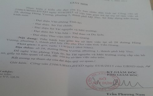 Văn bản yêu cầu Thư viện tỉnh Tiền Giang phải tạm di dời sang địa điểm khác nhường chỗ cho doanh nghiệp