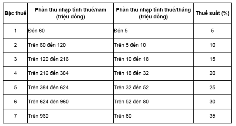 - Thuế suất: Thuế suất thuế thu nhập cá nhân đối với thu nhập từ kinh doanh, từ tiền lương, tiền công được áp dụng theo Biểu thuế lũy tiến từng phần quy định tại Điều 22 Luật Thuế thu nhập cá nhân, cụ thể như sau: