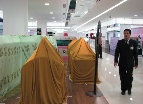 | Tầng một, nhiều gian hàng phủ kín để phản đối đơn vị quản lý. Ảnh: Hoàng Lan. |