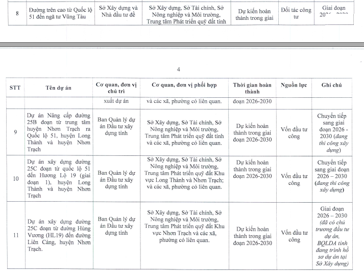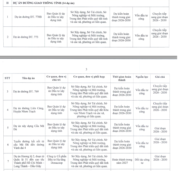 Đây là các dự án lớn, chủ yếu sử dụng vốn đầu tư công, vốn ngoài ngân sách và phương thức đối tác công tư (PPP), nhằm phát triển hạ tầng giao thông, kết nối khu vực sân bay Long Thành và thúc đẩy kinh tế - xã hội tỉnh.