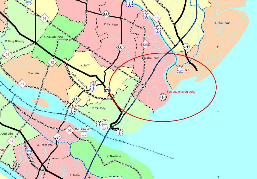 Điểm đáng chú ý là quy hoạch đã đưa vào phương án nghiên cứu vị trí sân bay chuyên dùng tại khu vực lấn biển xã Bảo Thạnh, Tân Thủy (thuộc phạm vi Ba Tri cũ), gắn với trục đường bộ ven biển. Sân bay chuyên dùng này được định hướng phục vụ công tác cứu hộ, cứu nạn, phát triển du lịch, hỗ trợ khu kinh tế ven biển và khu kinh tế mở rộng trong tương lai.
