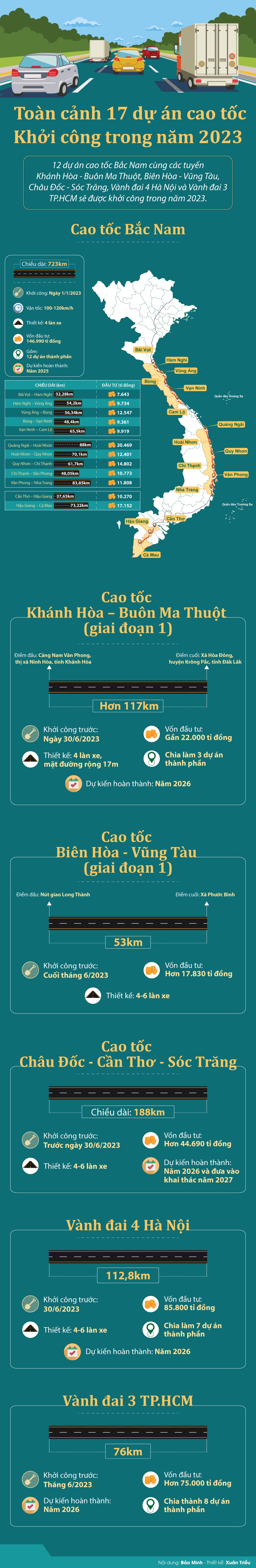 Vào đúng dịp Tết dương lịch (1/1/2023), toàn bộ 12 dự án thành phần cao tốc Bắc - Nam giai đoạn 2 (2021 - 2025) sẽ được khởi công đồng loạt trên địa bàn 9 tỉnh Hà Tĩnh, Quảng Bình, Quảng Trị, Quảng Ngãi, Phú Yên, Bình Định, Khánh Hòa, Hậu Giang, Cà Mau.